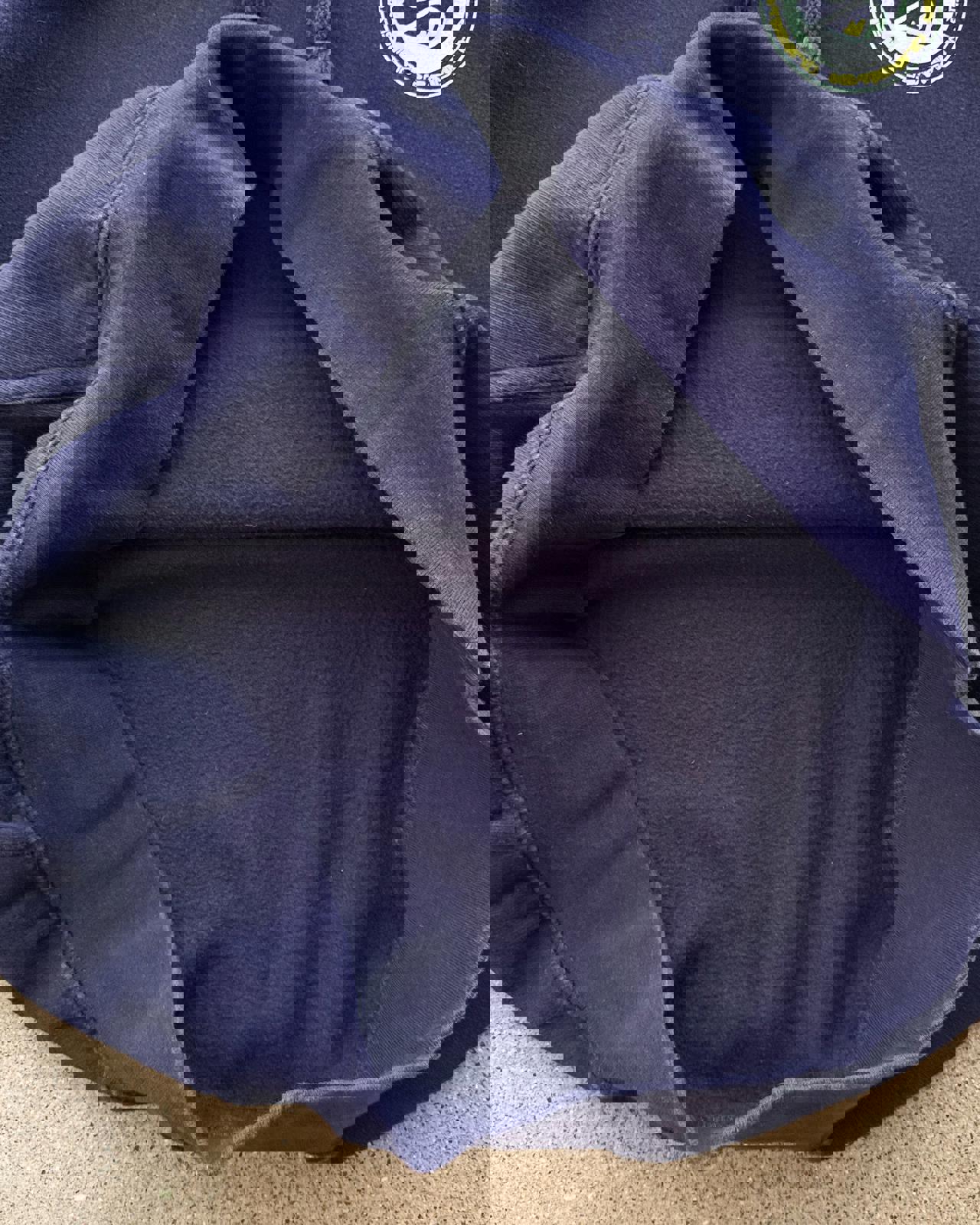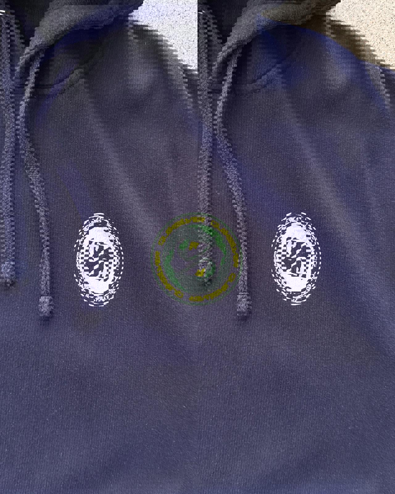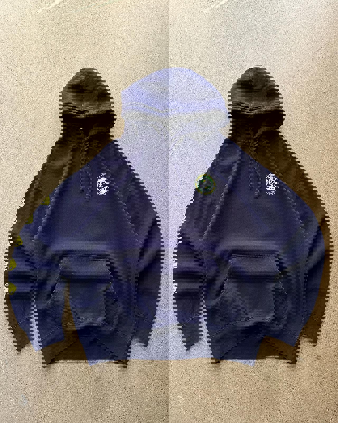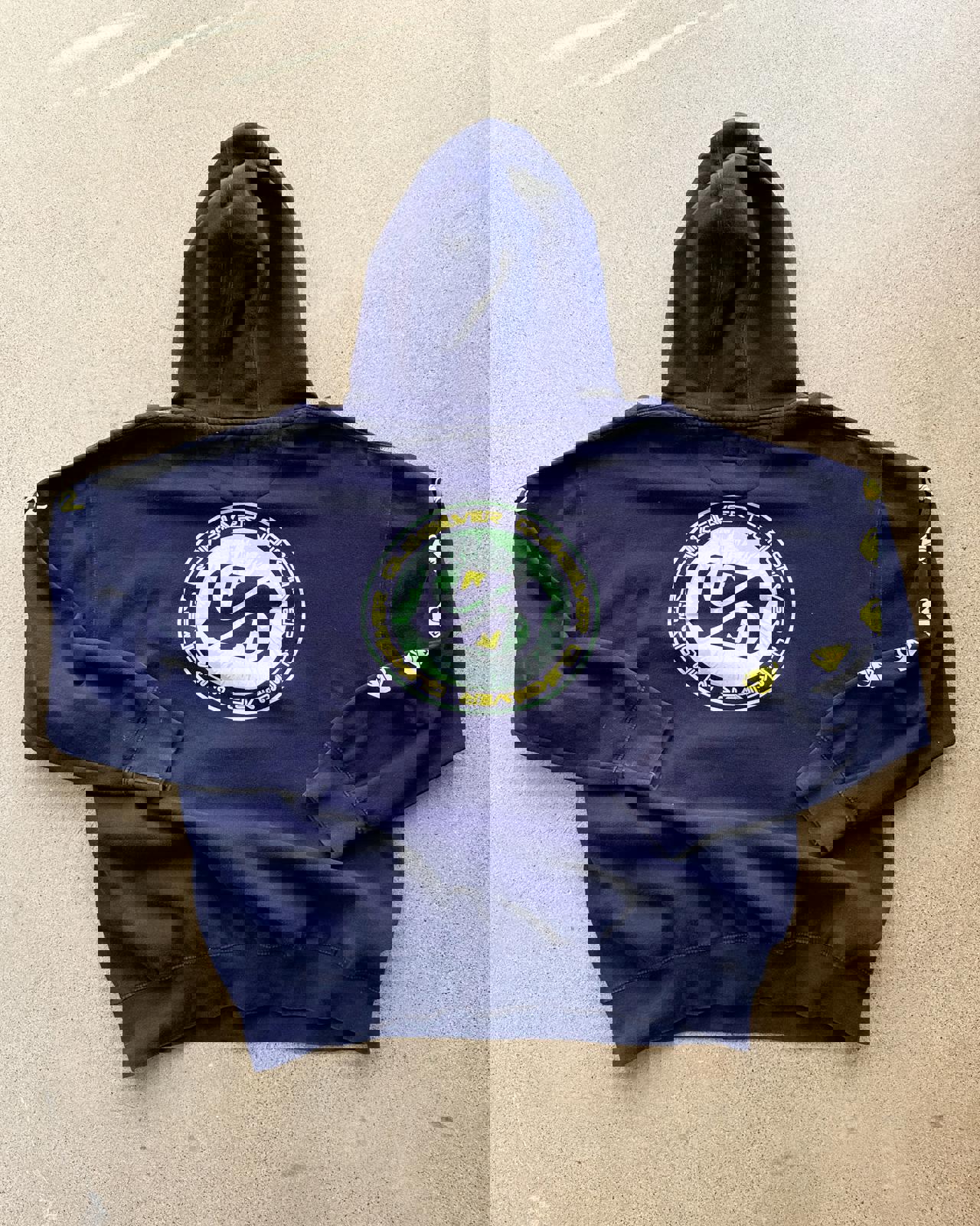 • 2000s era, XL hoodie for oversized fit, nice navy blue fabric with graphic prints on the front back and sleeves